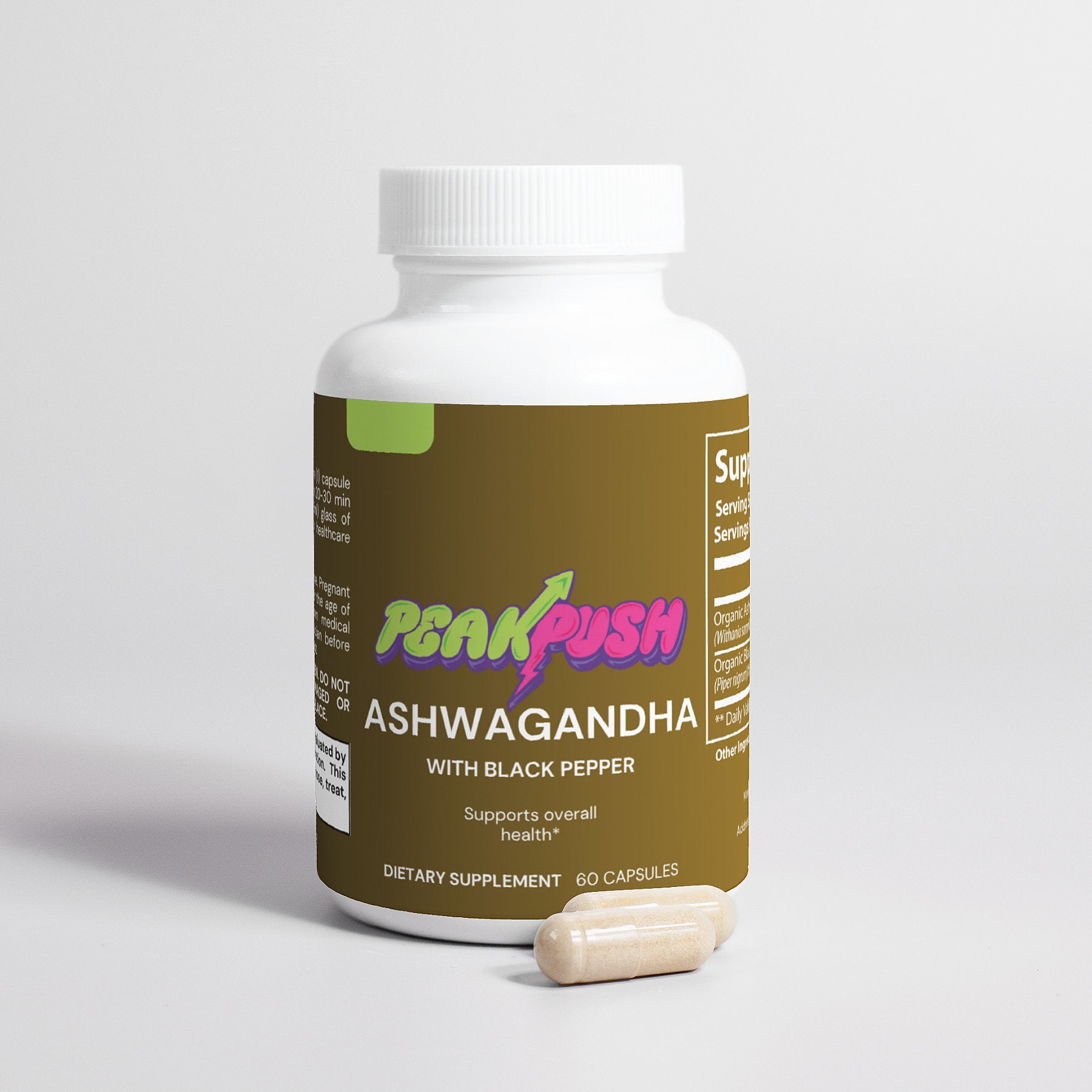 Ingredients: Organic Ashwagandha (Withania somnifera)(root), Organic Black Pepper (Piper nigrum)(fruit), pullulan capsules.